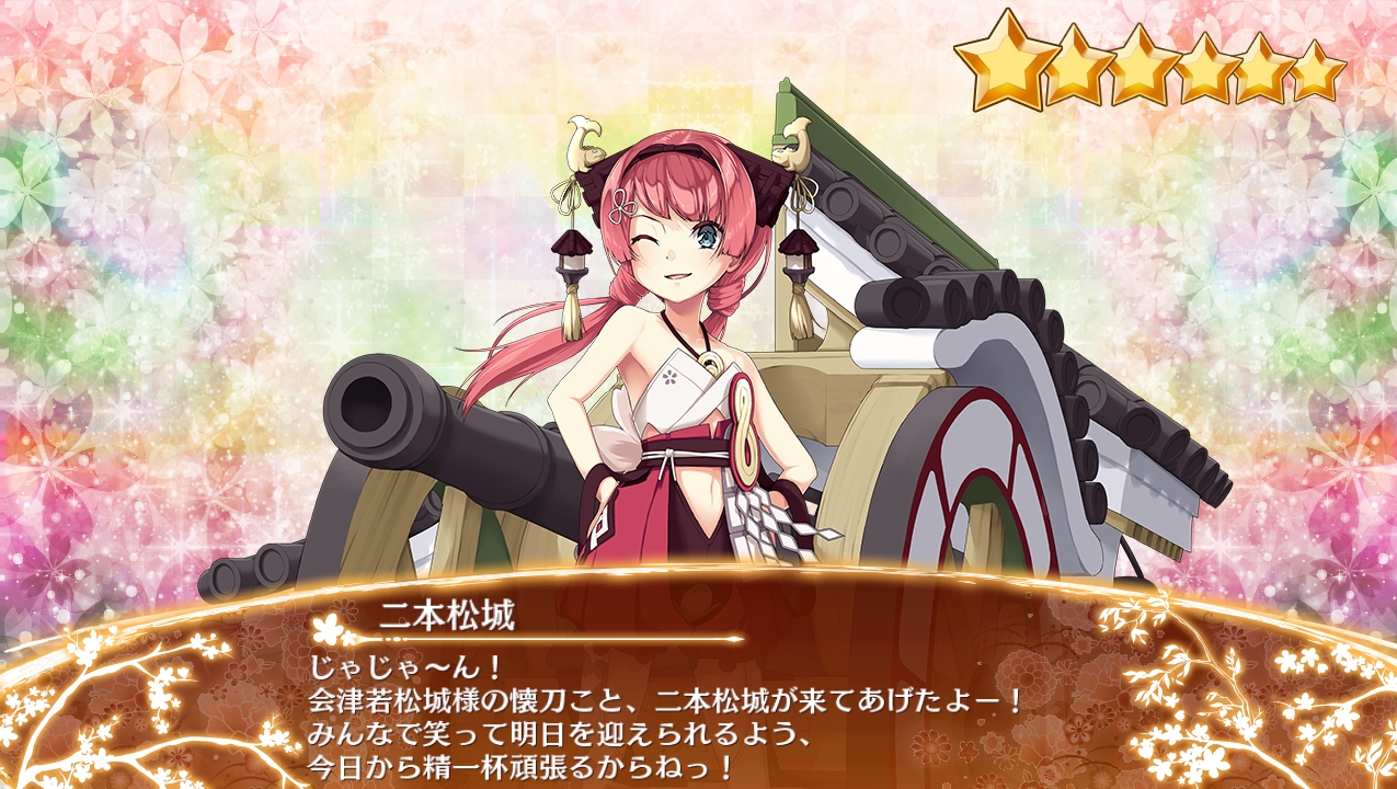 | 1 | 966 | 400 | 0 | 30 | 0 | 耐久/回復強化【範囲】 範囲内の城娘の耐久が20%、回復が20上昇 |