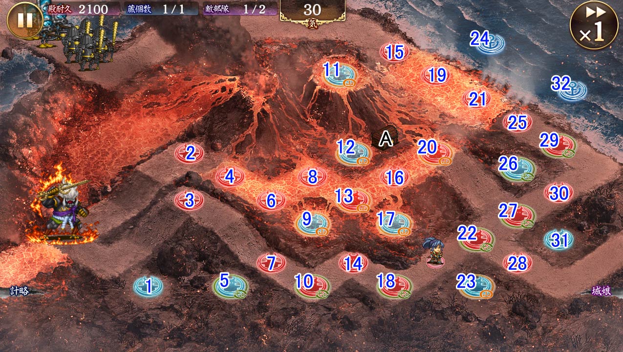| 城娘と伏兵に継続ダメージが発生 平山、山の属性強化マスが配置 |