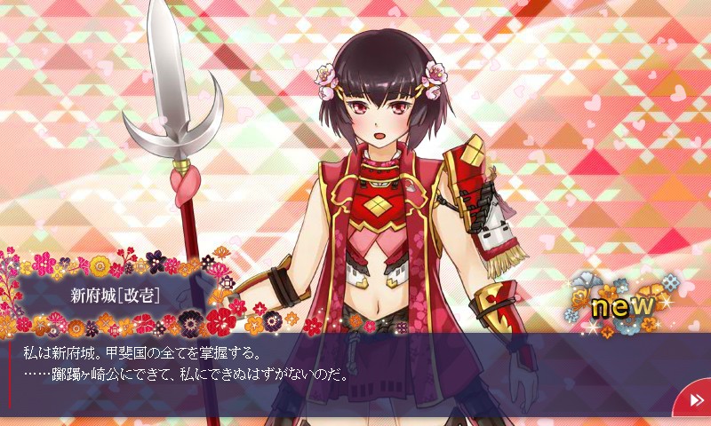 | 私は新府城。甲斐国を受け継ぐ者だ。 偉大なる躑躅ヶ崎公のように国をまとめ、戦場においても卓越した戦術で最高の戦果をあげてみせよう。 ・・・・・・その、最近は・・・・・・本当に私にできるのか、不安になることもあるのだが・・・・・・ | ||||