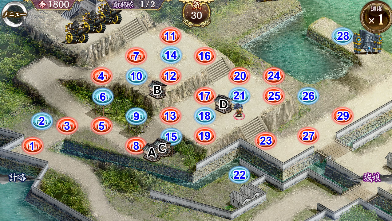 長射程城娘を21に、殿前の23に近接城娘を配置すれば、大体は2人で処理可能だが、LV50台だとやや厳しいかも。
