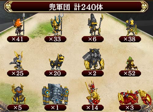 第4波最後に左下から出てくるボス兜(兜軍団画像 一番下の段、左から2番目)は通常の攻撃が遠近関係なく通り難い。