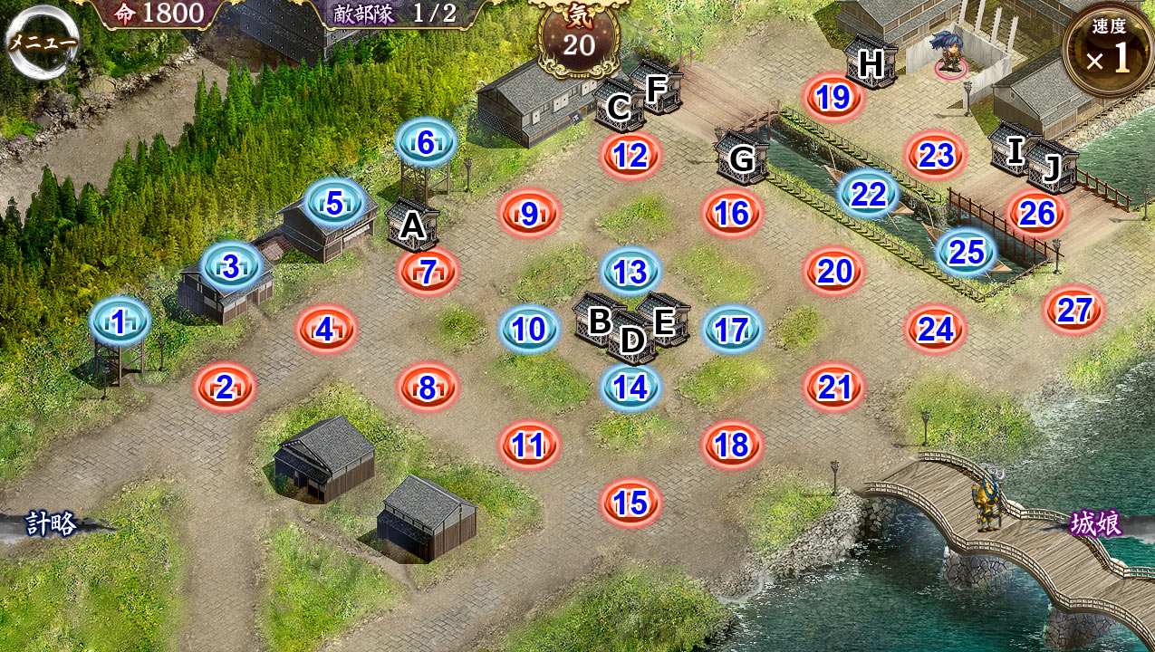 左の青マスに長射程城娘を配置しておけば、接敵前に騎馬兜を撃てる。