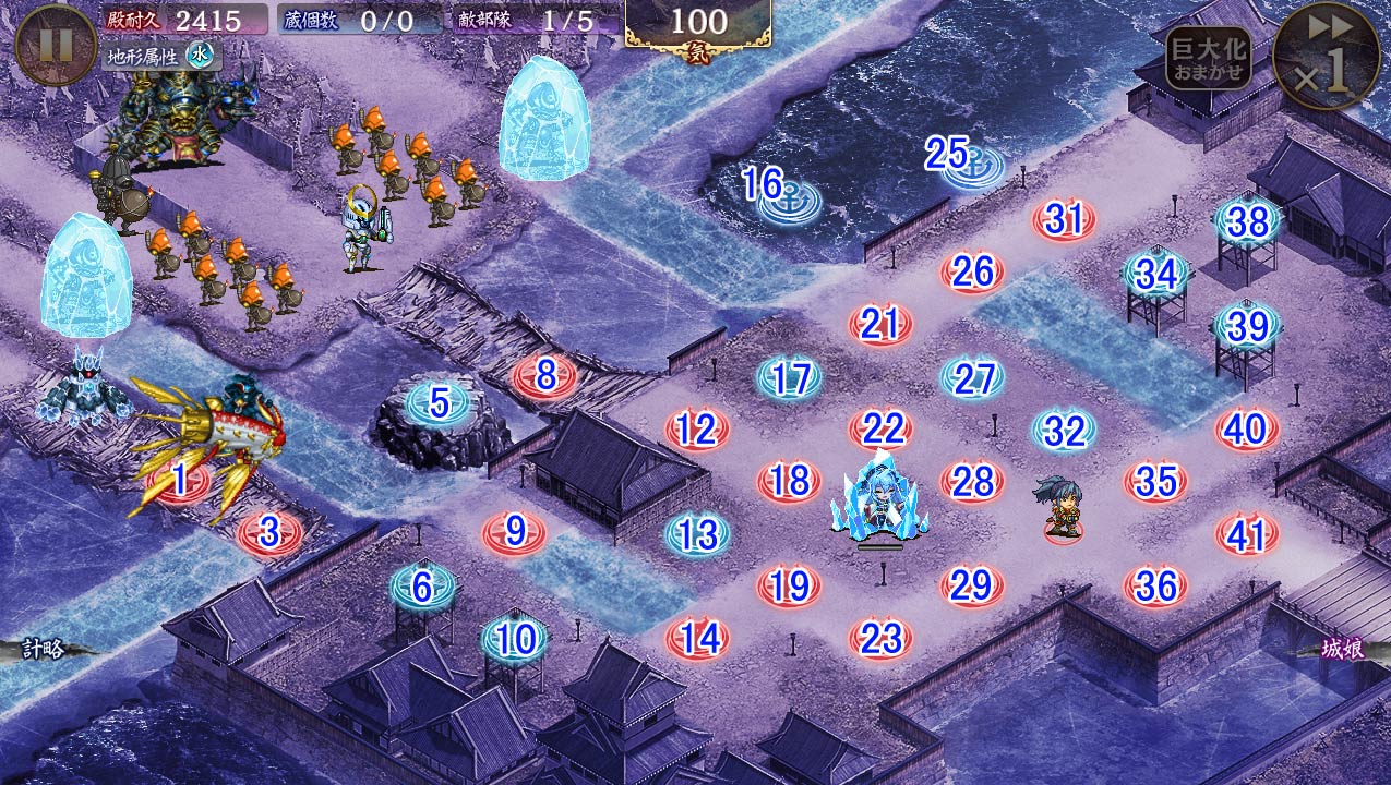 | 2 | 敵味方性能変動 | 大将兜以外の敵の耐久、攻撃、防御を150%上昇 遠隔城娘の巨大化消費気3倍、近接城娘の射程30%低下 |