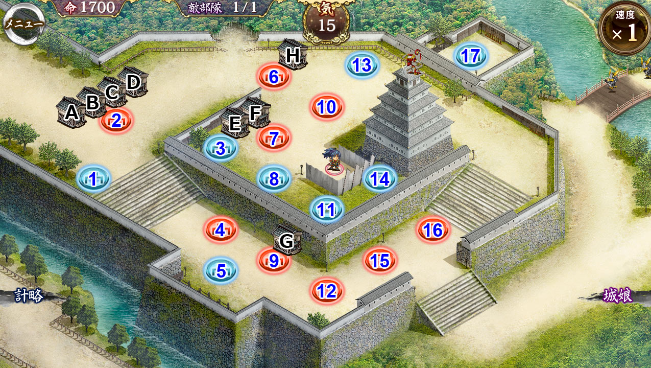 MAP右上の城外部分を通過した敵は、北中央の小さく開けた部分から蔵Hの至近距離にいきなり出現する。