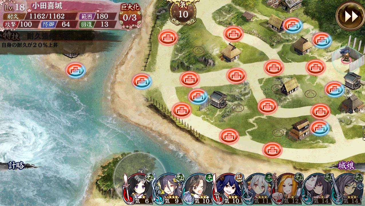 • ホンこれ。中盤に右下から上方向に来る団体に鉄砲隊がすぐやられがち… 忘れずに近接型を配置変えしないとダメだね。水合わせで入れた若松城とかが特に危ない。 -- 2017-03-12 (日) 02:55:37