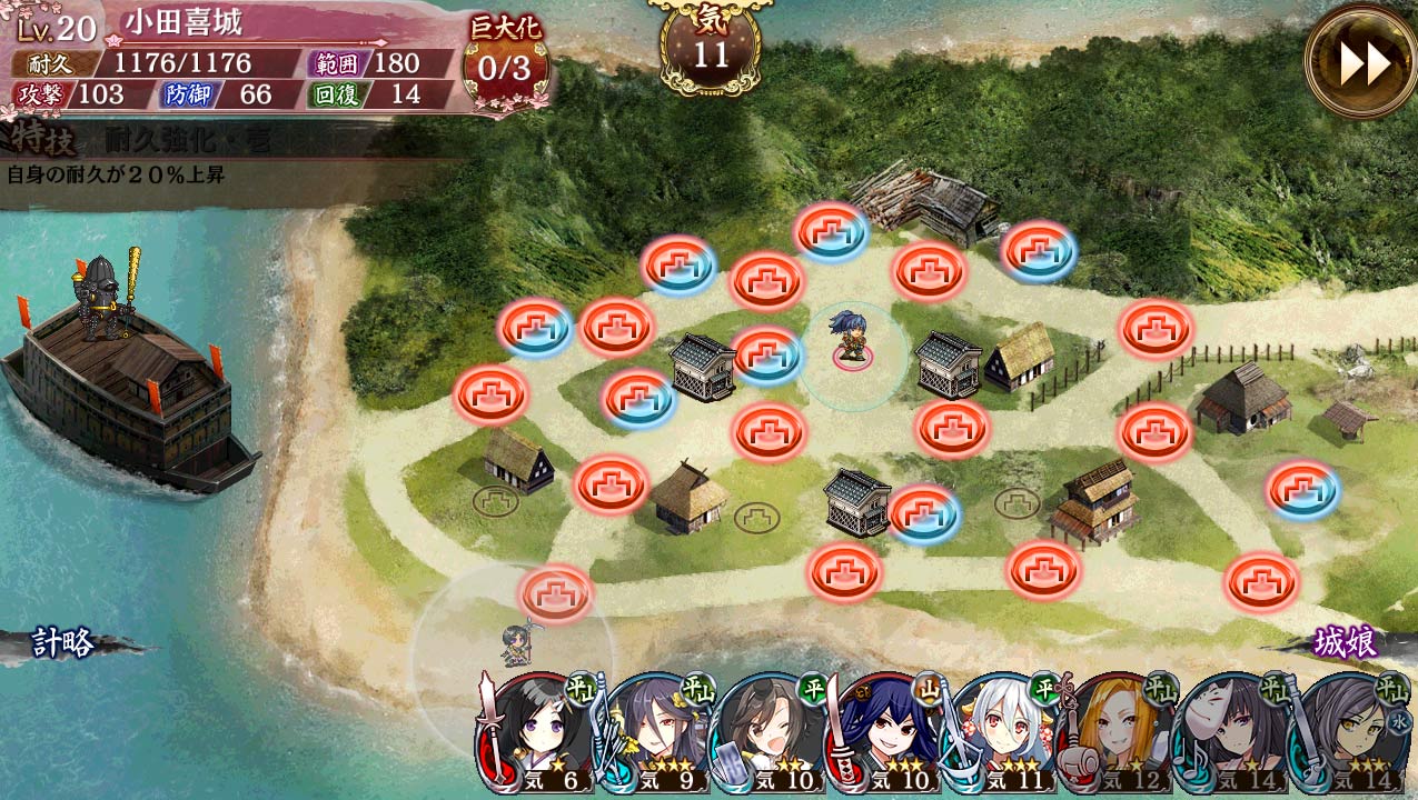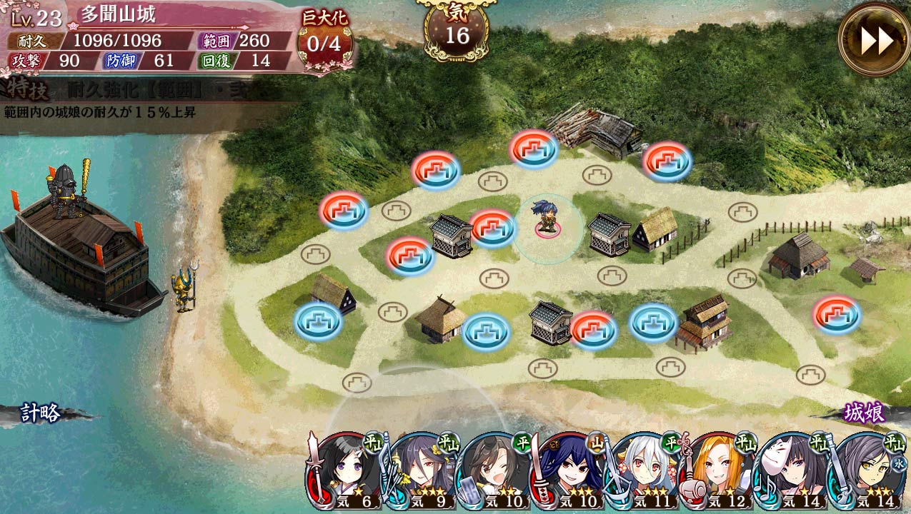 大将兜は居ないが、天下統一屈指の難易度を誇るステージ。 殿のナナメ4方向に進攻路があり、それぞれに陣を展開する必要がある。