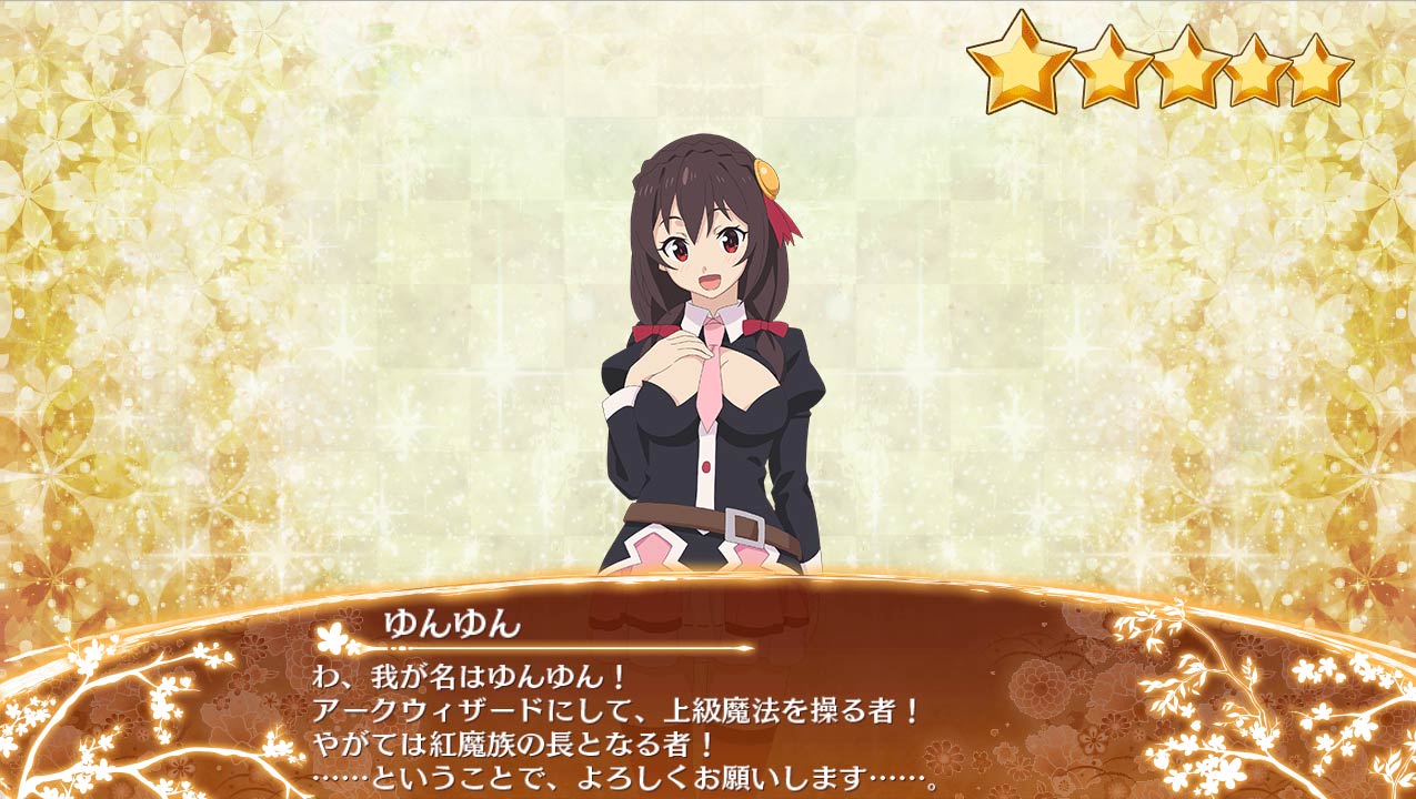 『この素晴らしい世界に祝福を!』に登場する、紅魔族のアークウィザード(魔法使い系上級職)の女の子。ゆんゆんはあだ名ではなく本名。