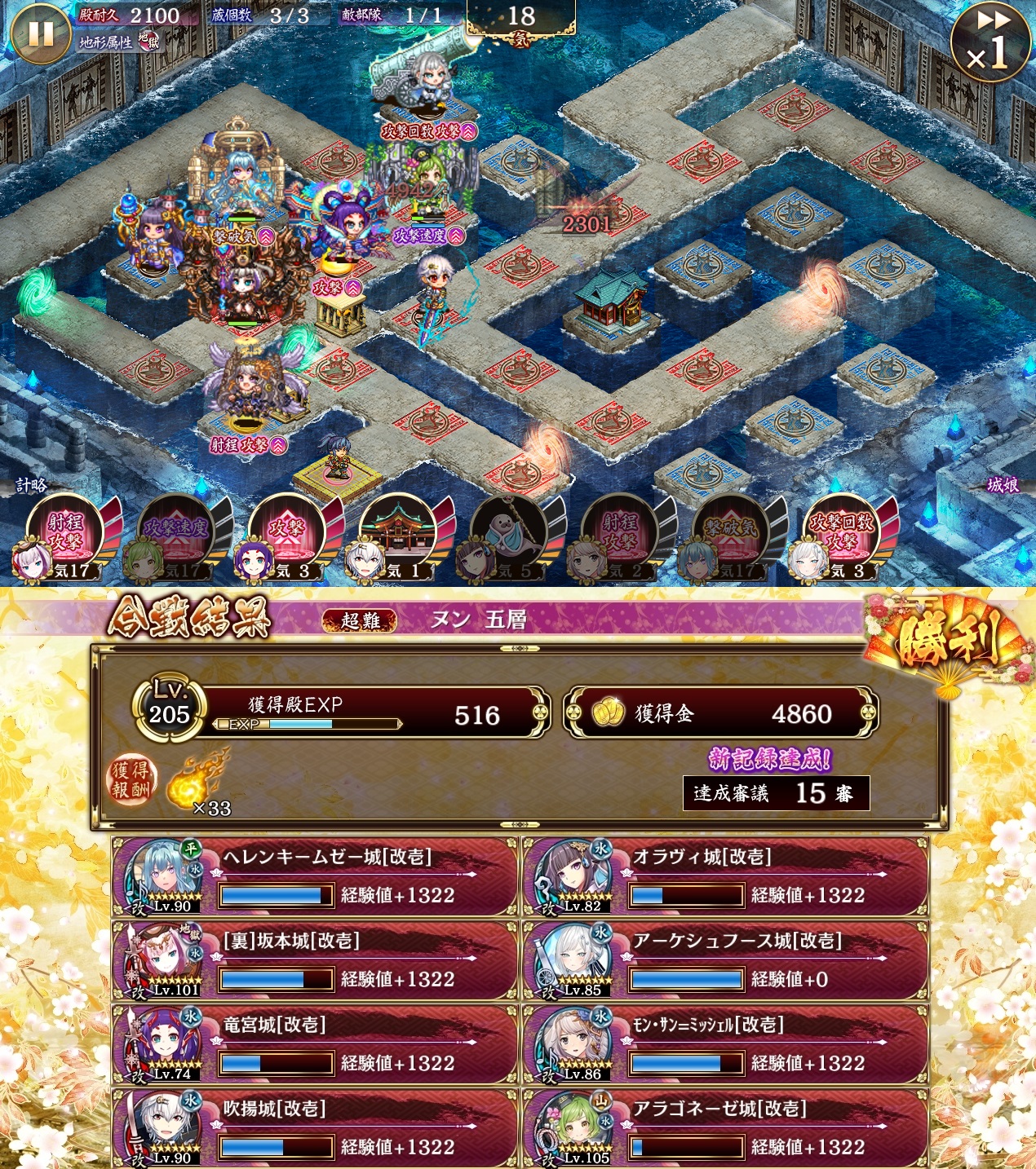 持っててよかった裏桜尾城。こいつが被ダメカットしてくれたおかげで蔵Aの周辺に色々置けた。最初の鯨がいなくなった後9にリンディスファーン置いとくと計略である程度気を稼いでくれるぞ。15審は取れたけど最低でも吹揚、モンサン、ダメカ役、水単アタッカー(舟とか大砲とか)いないと厳しいなと感じた。 --