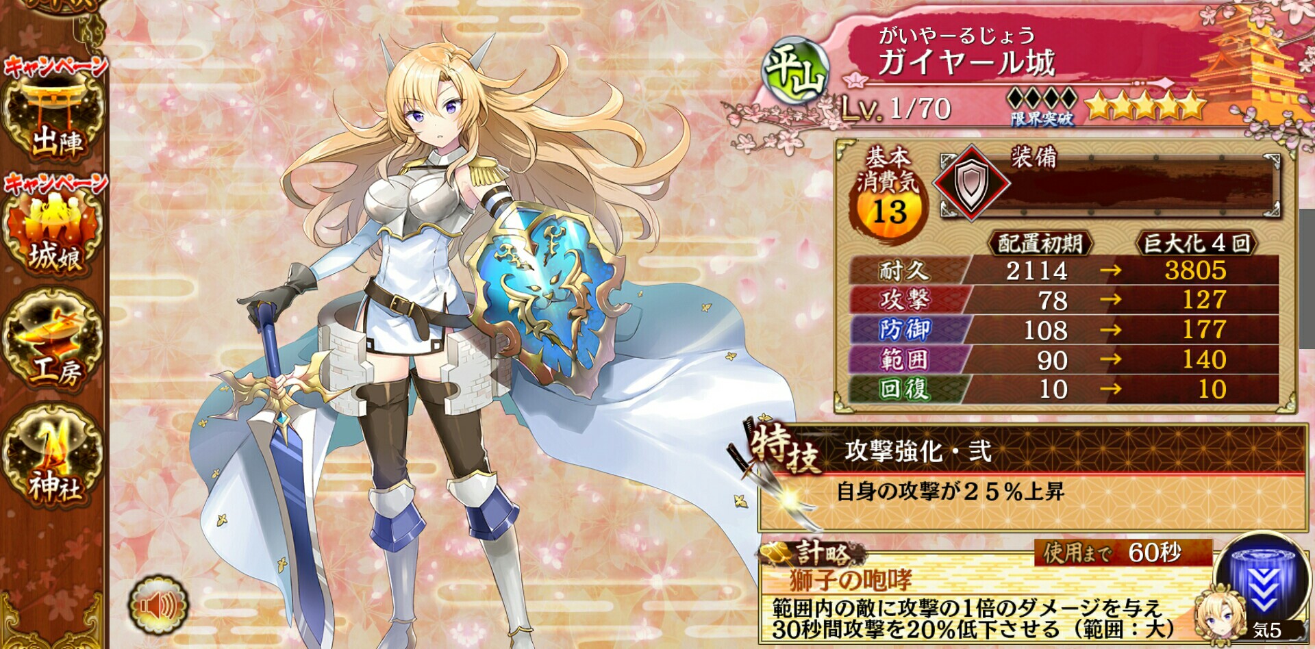 あ、ちなみに特技:【攻撃強化・弐】自身の攻撃力が25%上昇、計略:【獅子の咆哮】範囲内の敵に攻撃の1倍のダメージを与え30秒間攻撃を20%低下させる でした。編集出来る方お願いします! もしかしたら有岡計略と使えば面白そうかも? --