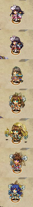 (基礎知識)①.常時4フレーム構成の行動モーションを繰り返し、待機モーションは存在しない。②.攻撃を行わないため向きが切り替わらず、常時右を向いている。③.配置すると同時に城娘上部に巨大化アイコンが表示され、武器エフェクトに重なる。④.最大化することで巨大化アイコンは消えるが、ドットバイドットではなくなる。 --