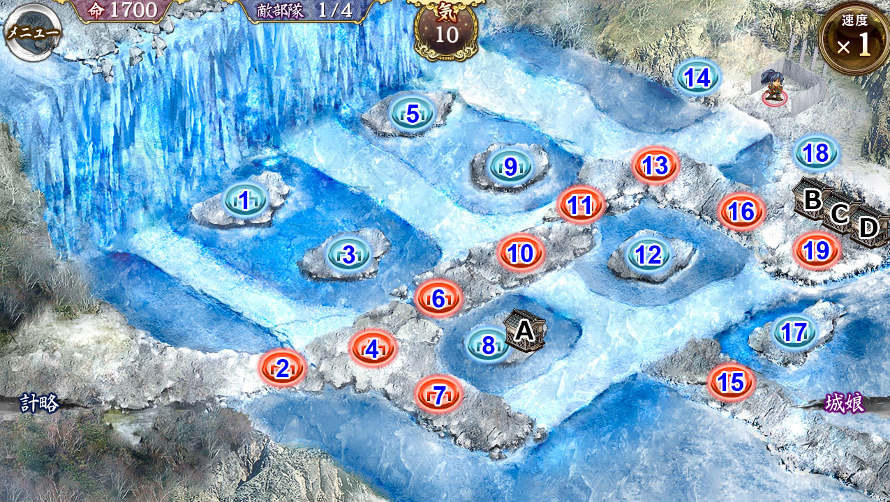 特別戦功を狙う上で特に厄介なのは一ノ谷形兜(通称メタグロス)で、特に7→19のルートを通る2体。19まで到達されるとそこで暴れてBCDの蔵が破壊される。そのためできれば7に足止め可能な近接ユニットを配置し、巨大化回復・撤退等を使って乗り切ろう。ただ、必ずしも7で仕留める必要はなく、19までに仕留めればよいので特に3wave目は無理せずに4w目に巨大化を残しておきたい。