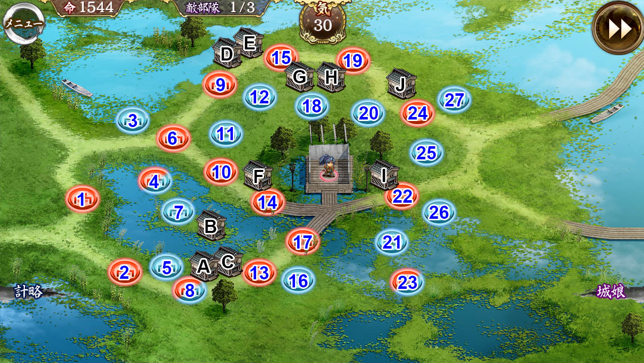侵攻ルートは左下から出現し、1、6、9、15、と、上を迂回してから殿へ向かってくる。