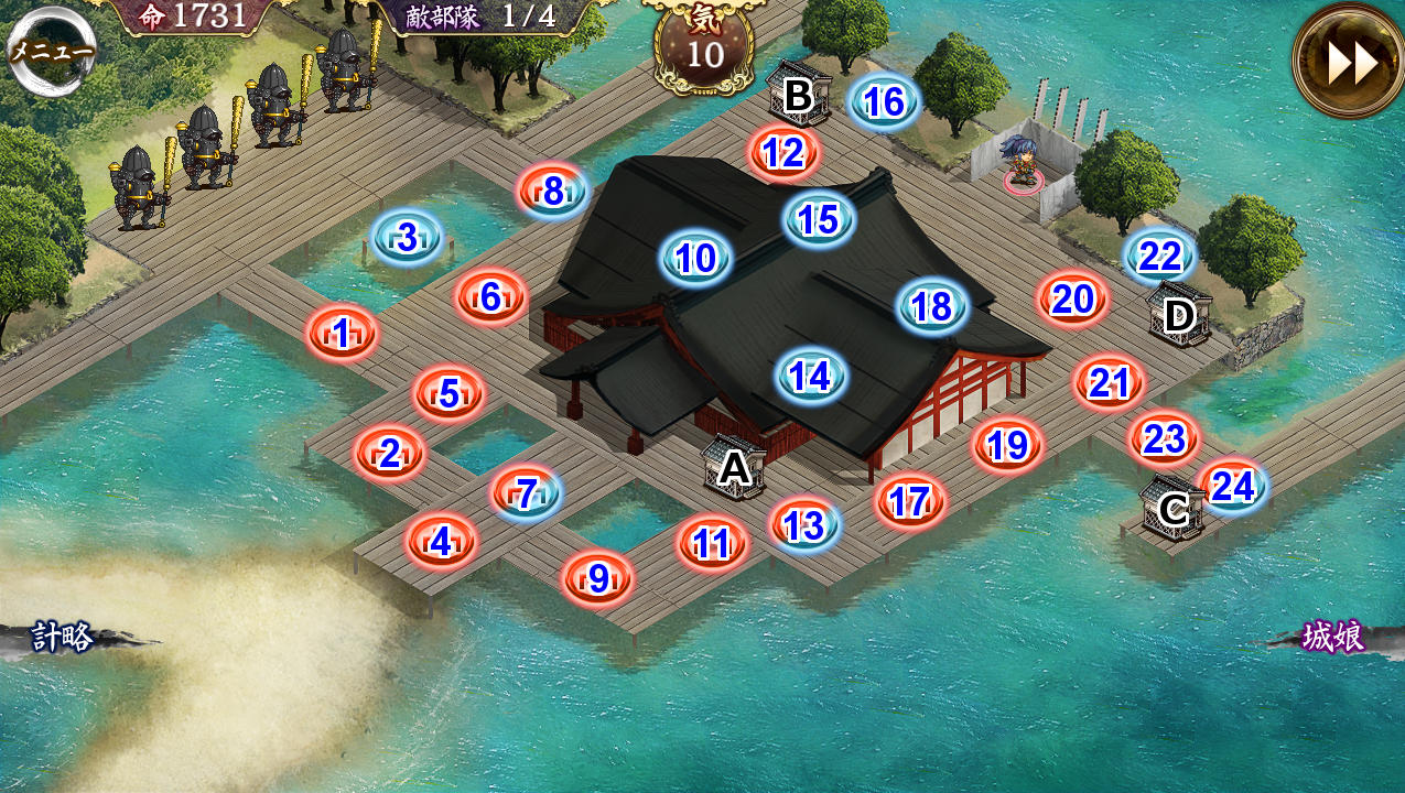 天下統一のストーリー前半を締めくくるに相応しい難所。城娘を単に並べているだけではクリアすら危うい。
