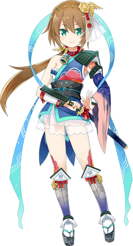 髪飾りは忍城の別名「亀城」から亀甲と「浮城」から羽が由来と思われる。