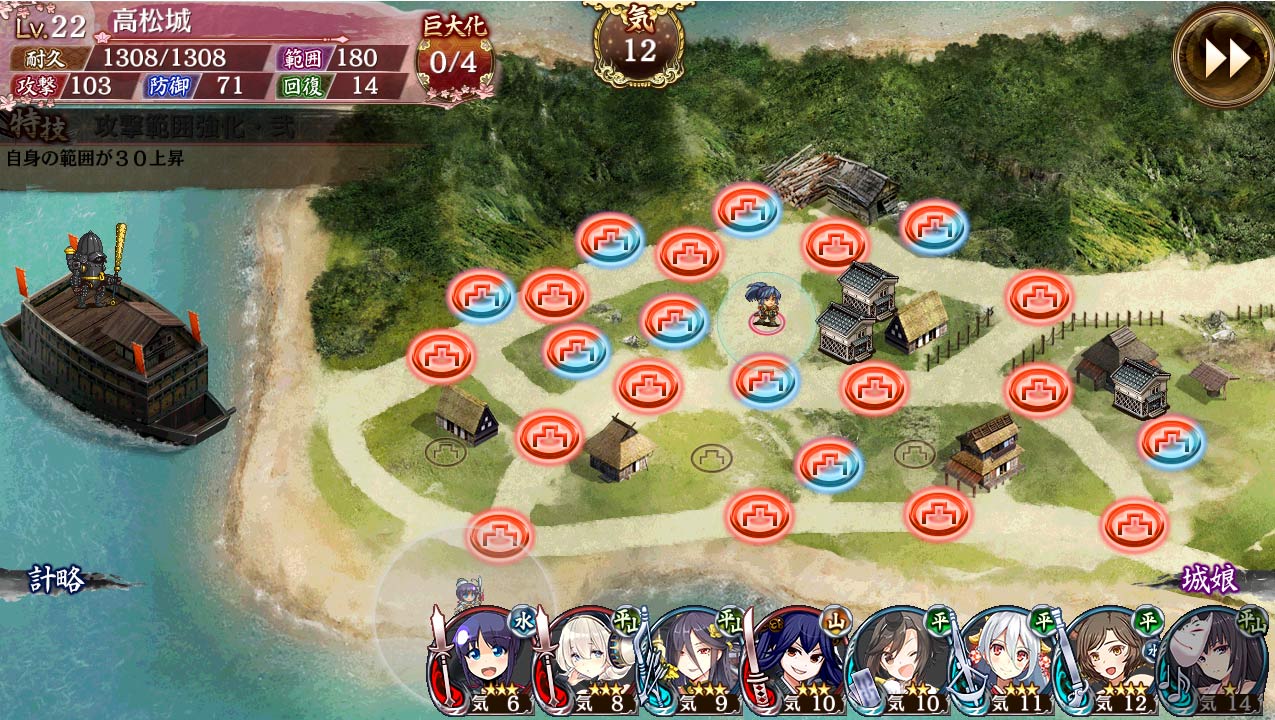 • 上の動画宜しく、上陸地点の小屋の前に鉄砲、画面下の小屋の横の青陣地に鈴(遠距離)を置いて、上の方に刀や、槍を固めて配置しました。上の動画のおかげで挑戦一回目でクリアできました。ありがとうございました。