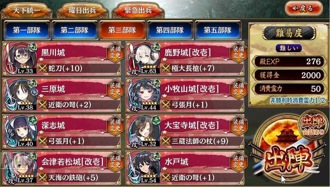 レア度とレベルの暴力でクリアできた。高知61、首里71、小諸63、松本52、二条63、宇都宮改壱61、和歌山60、彦根77で全蔵防衛と大破・撤退なし殿ノーダメ --