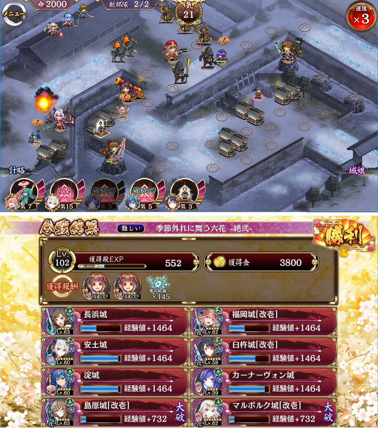 島原がそこだと法術でやられるからその位置は長浜かな?安土を長浜の位置に置いてカナボンをマルの位置、マルは殿眼前で良いかと。島原は臼井の計略の位置である4で臼井は23かな?島原さんより杵築城の方が回復特技がある分おすすめだが出来なくはないというか出来た。マルもってなかったからコンウィで代用出来たし臼井のレベルも画像より10低いけどあとは武器以外再現出来た。画像の載せ方分からんから証拠だせないけどもこのメンツなら行けるから大丈夫、自信持ってな! --