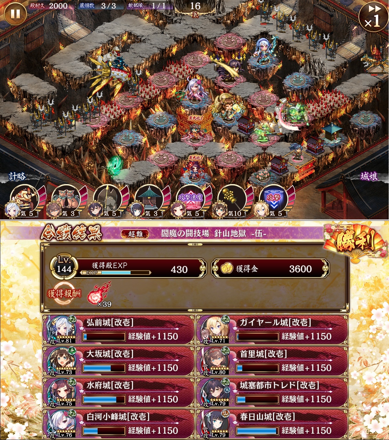15審達成、3徳川伏見、5絢爛会津若松、8甲府、13裏小牧山、17浜松、9彦根、10肥前名護屋、18掛川で会津若松の特技計略と掛川の移動射程デバフで鉄壁になるね。引いてて良かった会津若松。 --