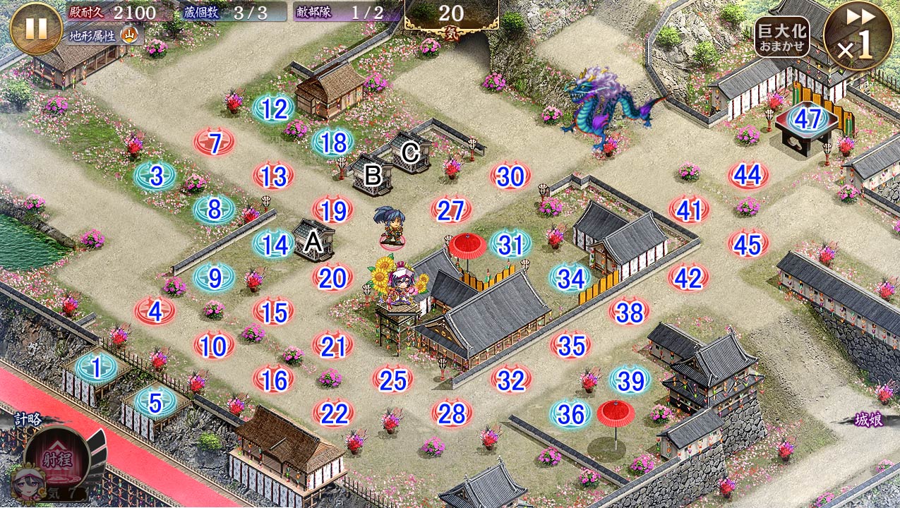 | 今回の合戦の難易度「普通」では、 『[花嫁衣装]勝野城』がお助け城娘として登場しています。 再配置や撤退を行うことはできませんが、巨大化と計略を駆使して勝利を目指しましょう。 |