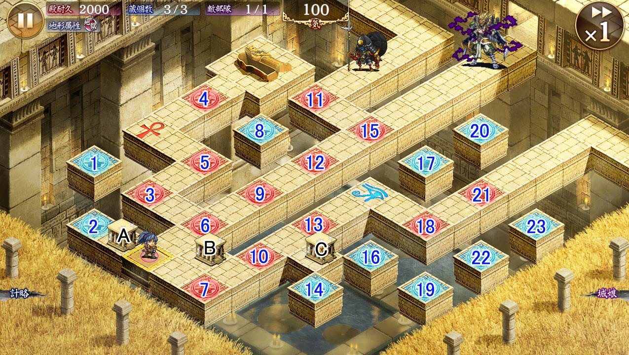 <アンクのヒエログリフ>![]() 地面に記されたアンクのヒエログリフへ到達した敵軍ユニットは、 攻撃が1.5倍、回復が100上昇します。 |
