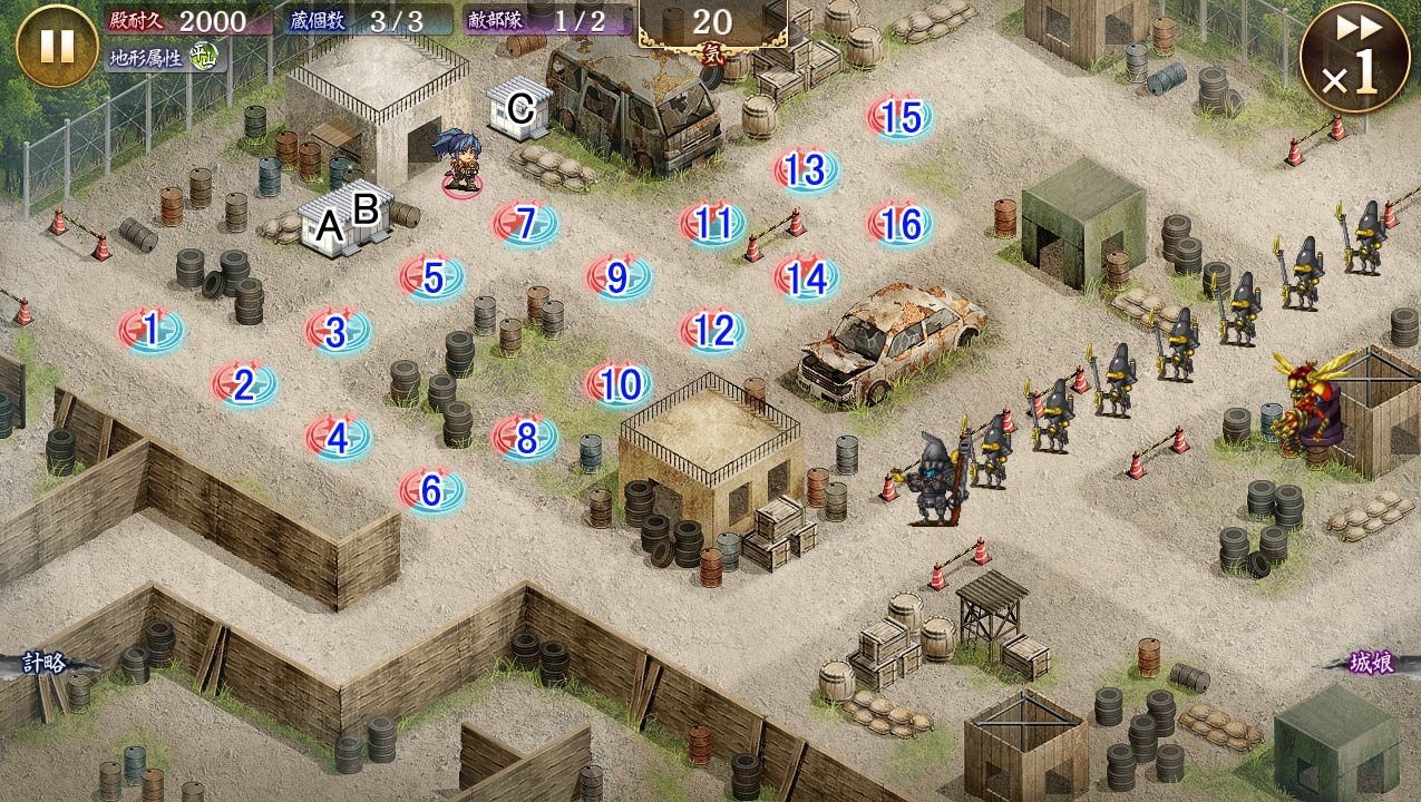 | 今回の合戦では、以下の戦場効果が発動しています。 防衛戦:殿から遠い位置いの配置マスが消滅している代わりに、全て近接マスになる。 |