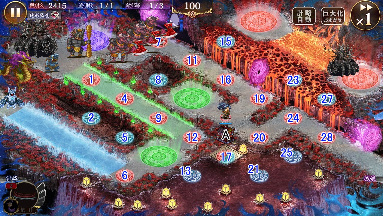 | 等活ルート上を進行する敵は、回復が800上昇します。 また、等活ルート上の配置マスに配置した城娘の回復が400上昇します。 |