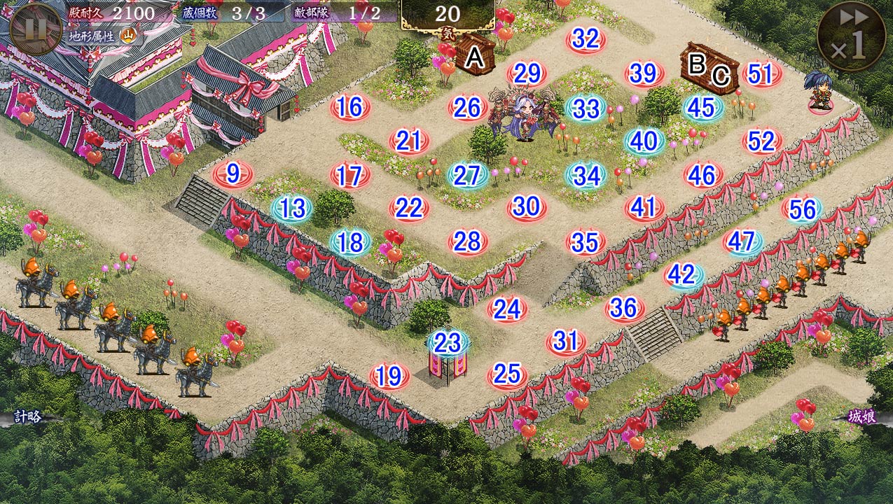 | 今回の合戦の難易度「普通」では、 『[バレンタイン]マチュ・ピチュ』がお助け城娘として登場しています。 再配置や撤退を行うことはできませんが、巨大化と計略を駆使して勝利を目指しましょう。 |