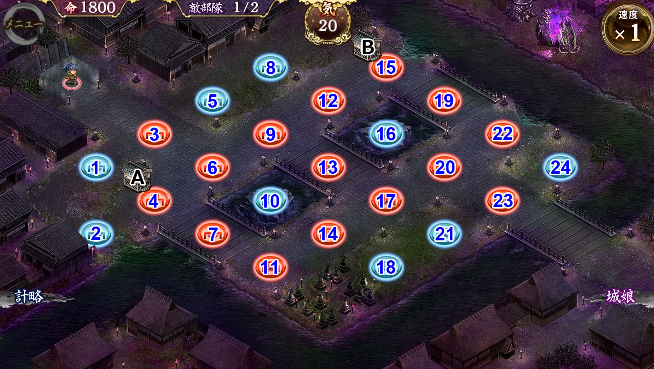前線組21ババ様、20&17一軍前衛、16歌舞、15硬い二軍前衛、回復範囲に入らないババ様は23や24ににデコイ置いたり倍速かけてやられる前にやる。本陣組として4石垣山(ババ様倍速要員)、1と5に杖や札置いて3に鉄狛置いて前線すり抜けた妖怪を始末する。完全に倍速ババ様万歳マップでしたわ。 --