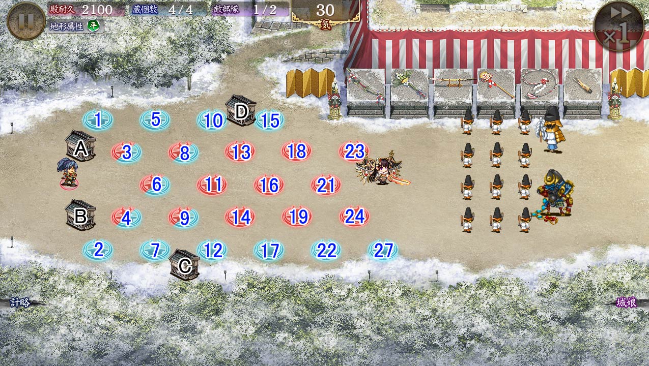| 今回の合戦の難易度「普通」では、 『[正月]江戸城』がお助け城娘として登場しています。 再配置や撤退を行うことはできませんが、巨大化と計略を駆使して勝利を目指しましょう。 |