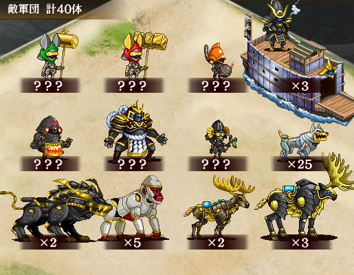 | 兜丸(敵船)は自身が倒されるまで船内から敵を登場させ続け、 船内に敵がいなくなると撤退します。 また、兜丸を撃破すると多くの気が獲得できます。 |