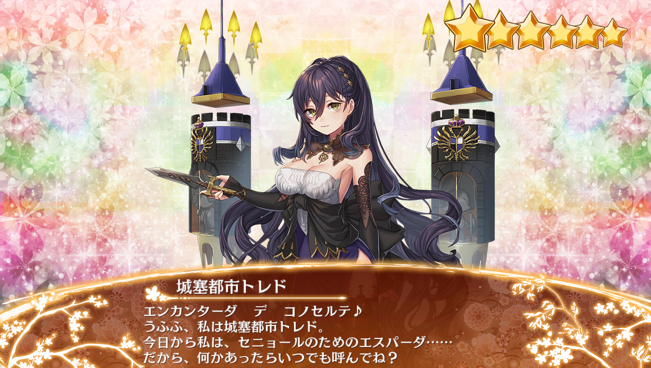 | 1 | 300 | 0 | 0 | 騎士道精神 範囲内の城娘の被ダメージを10%軽減 城塞都市トレドへの攻撃を代わりに受ける 配置制限:赤マスのみ | ||