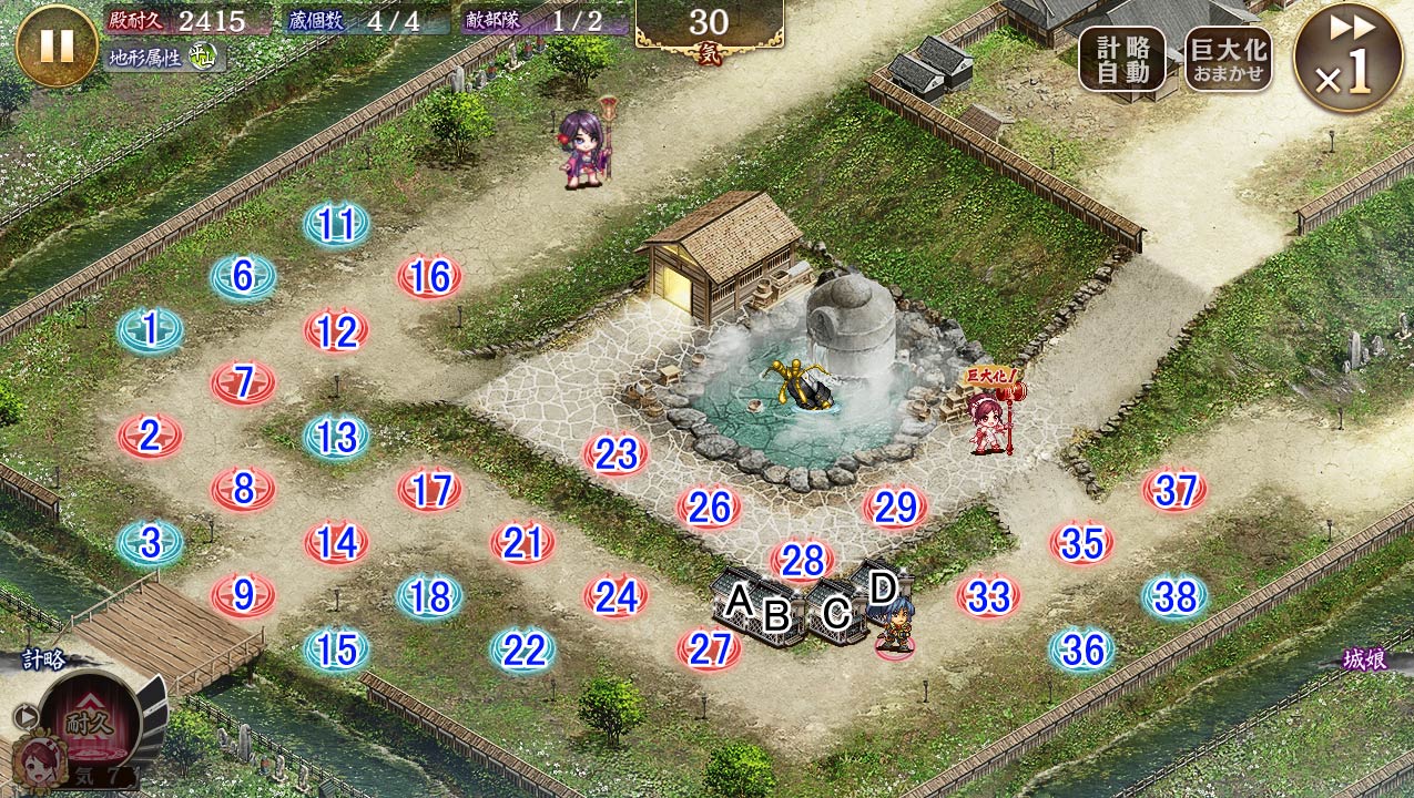 | 今回の合戦の難易度「普通」では、『[温泉]山中城』がお助け城娘として登場しています。 再配置や撤退を行うこはできませんが、巨大化と計略を駆使して勝利を目指しましょう。 |