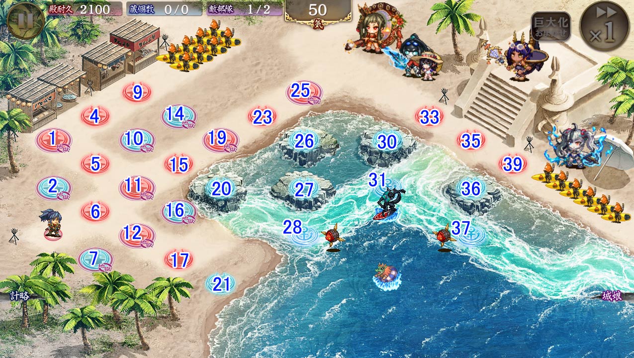 | 今回の合戦の敵城娘は性能が大幅に強化されています。 また、進行を開始するまで攻撃対象になりません。  |