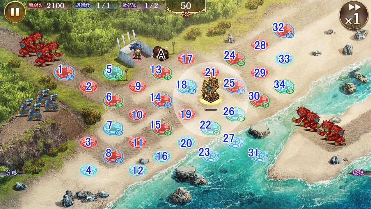 | シーサー像:射程内の沖縄城娘が強化 平、水の属性強化マスが配置 |