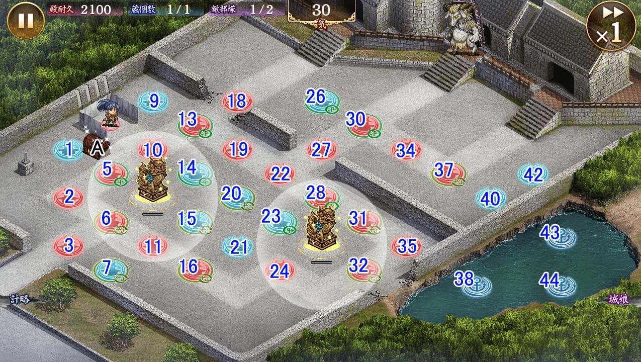 | シーサー像:射程内の沖縄城娘が強化 平、平山の属性強化マスが配置 |
