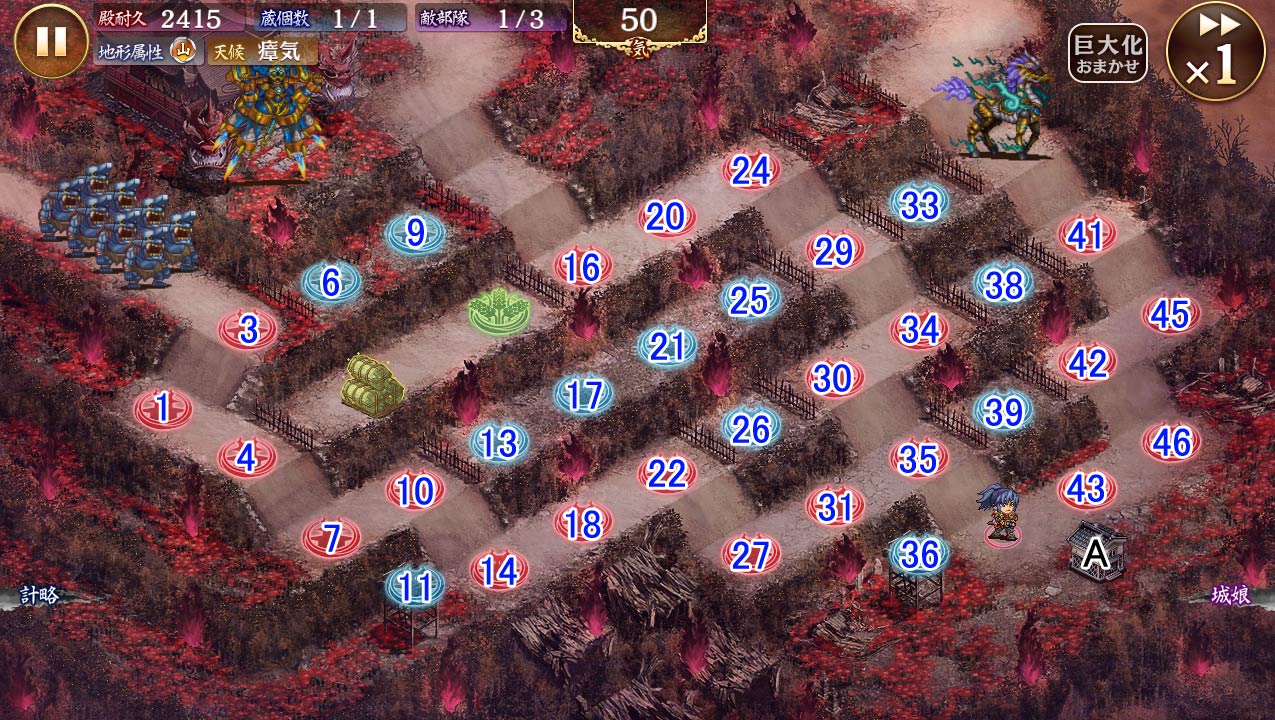 | 今回の合戦では以下の天候効果が発生しています。 瘴気:敵の与ダメージと城娘の被ダメージが50%上昇。 |