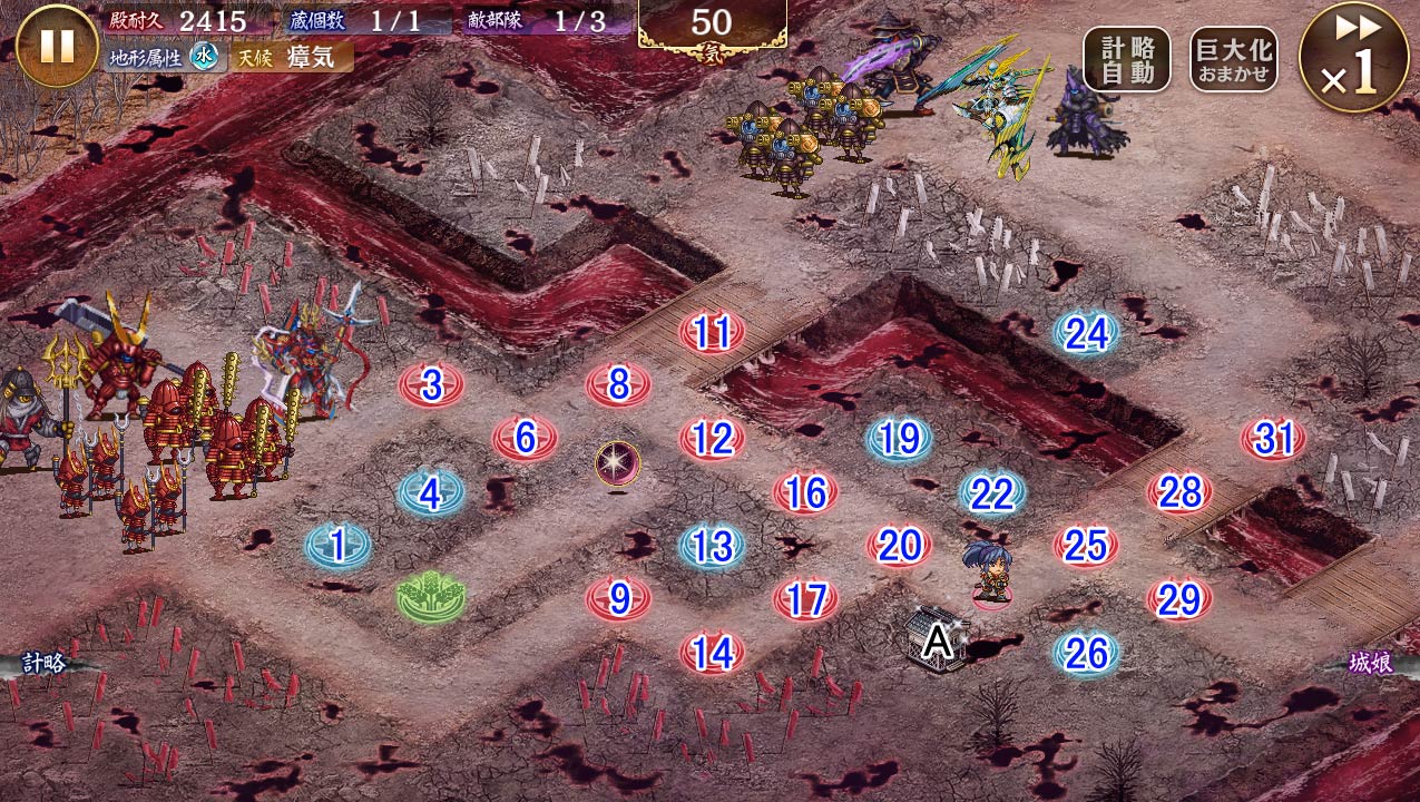 | 今回の合戦では以下の天候効果が発生しています。 瘴気:敵の与ダメージと城娘の被ダメージが50%上昇。 |