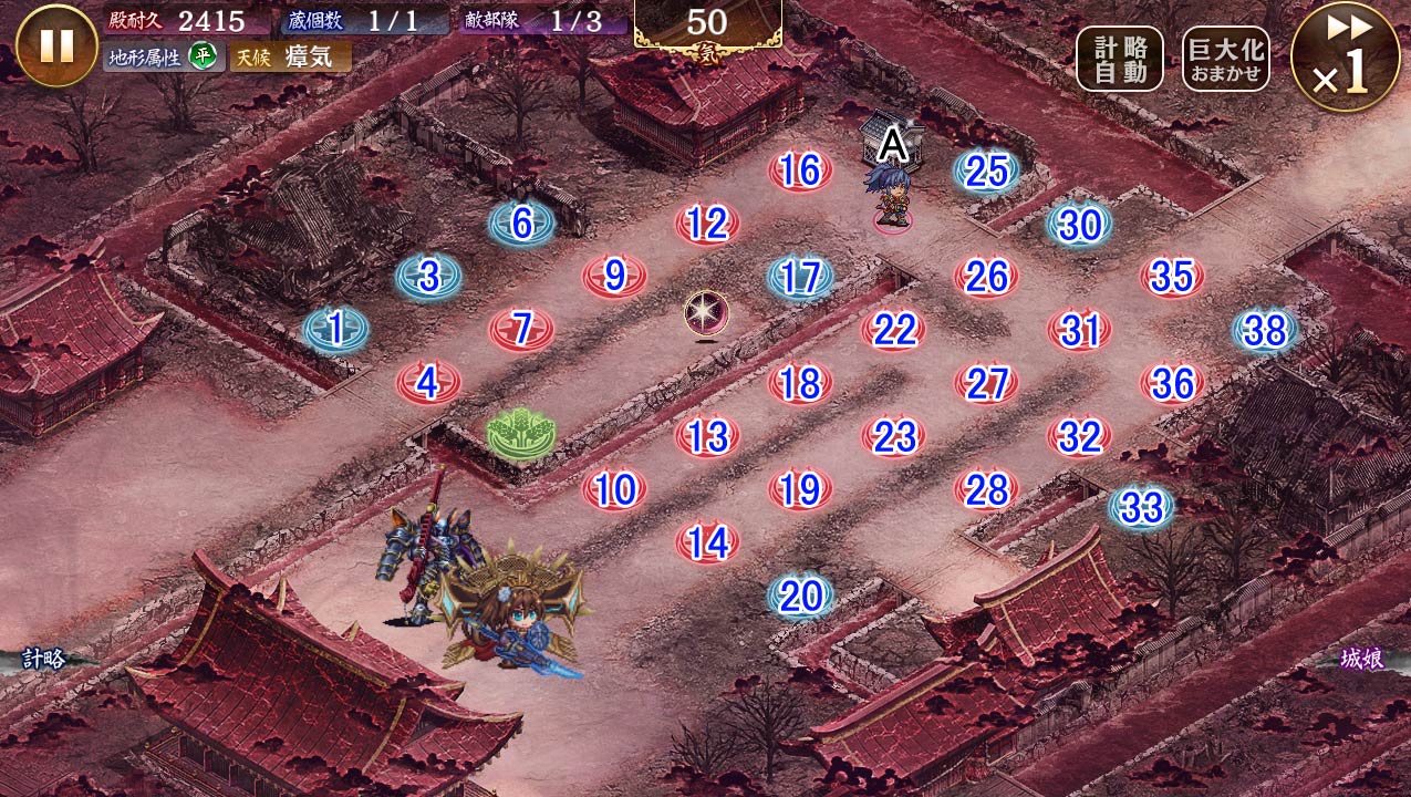 | 今回の合戦では以下の天候効果が発生しています。 瘴気:敵の与ダメージと城娘の被ダメージが50%上昇。  |