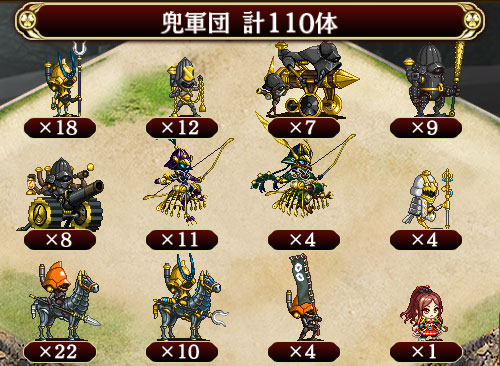 。レベルが低くても殿の事故死だけはしない安全第一フォーメーション。山科だと14は入ってるけど、13には届かず。コツは、既出の情報だけど旗を先に倒そうとするよりも(この場合20の巨大化よりも)まずは4を死なない程度に巨大化させることと、12の火力が非常に重要であること。 --