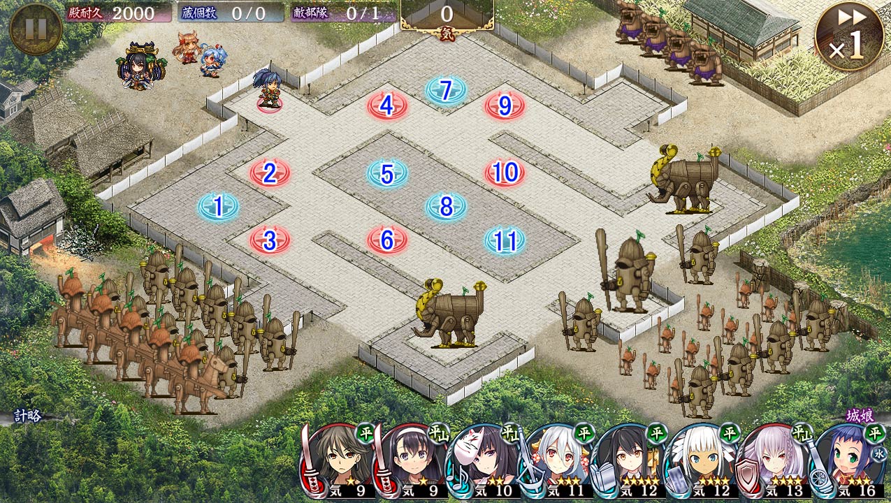 殿が攻撃を食らうことが前提の攻略法です。始まったらすぐに 5本 そしたら続けて11石弓4刀(平山)9刀(平)1大砲3盾の順に置く。次に大砲を一回最大化したら7法術8歌に置いて1大砲4刀(平山)の二体を一回ずつ最大化。そのあと2刀(平)を二回最大化。殿が攻撃食らうけど死なないから放置。気力がたまりしだい大砲を一回最大化。そしたら大きい騎兵に攻撃が届くのですぐに騎兵に防御ダウンをかける。気力がたまったら大砲を一回最大化。殿が攻撃されるので妖怪に防御ダウンをかける。象がせめて来たら2刀(平)を一回最大化。石弓の攻撃範囲から左側の象が外れたら11石弓と8歌を撤退させる。そしたらすぐに3盾を二回最大化。右側の象が倒れたら4刀(平山)と7法術を撤退。この後は放置してれば攻略できる。計略をもう少しうまく使えば楽に攻略できそうです。 --