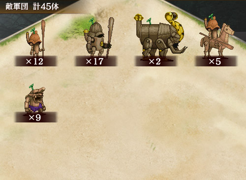 4盾のまま戦功クリアはできるけど、4は最大化したこほーちゃんの攻撃範囲に入るので、象の足止め場所としては不適。10に盾を再配置して、こほーちゃんは騎馬の攻撃に専念してもらう方が戦術としてはスマート。 --