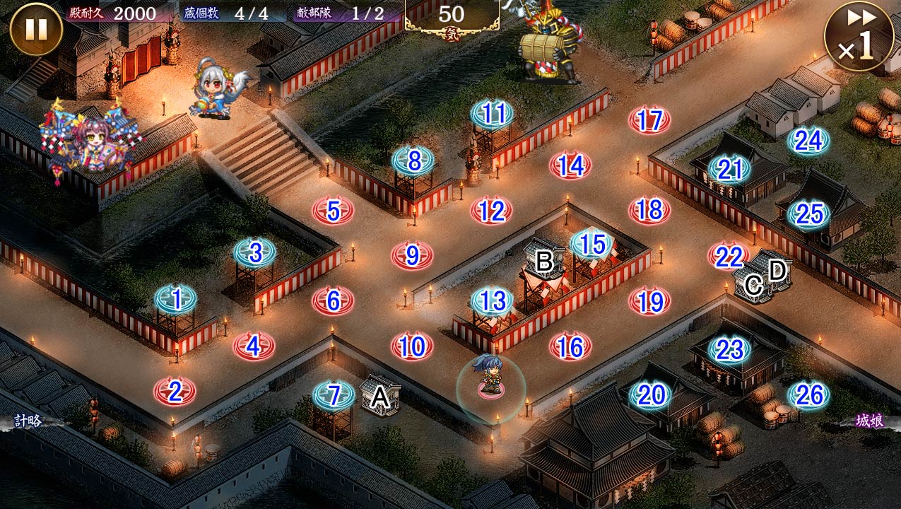 | 今回登場の[正月]城娘たちは、以下の特技・計略を発動しています。 [正月]小田原城: 自身の射程が30、攻撃が30%少々、ターゲット数が1増加。 射程内の敵軍ユニットの攻撃速度が25%上昇。 [正月]小峯城: 自身の攻撃後の隙が30%短縮、攻撃速度が1.5倍、 攻撃が敵の防御を50%無視。 射程内の殿側ユニットの被ダメージが20%増加。 [正月]甲府城: 射程内の殿側ユニットの与ダメージが25%減少。 射程内の敵軍ユニットの攻撃速度を25%上昇。 全ての殿側ユニットの防御が80低下。攻撃対象の攻撃速度が10秒間30%低下。 [正月]一条小山城: 全ての敵軍ユニットの耐久が600上昇。 ※一条小山城は攻撃対象にならず、回復行動を行いません。 |