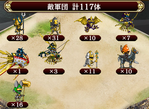 19槍、30鉄砲、21大砲、3鈴、8弓、6弓、17弓、24歌舞。右側は歌舞だけ先に巨大化して後は左に置いた3匹を優先させていったら全蔵&殿無傷で行けた。 --