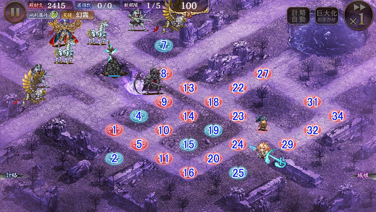 | ※武神が降臨した地では、気の自然回復量が通常の半分となります。 戦場効果 天候(幻霧)種別が「幻想」の敵ユニットの回復が300上昇 条件を満たすと登場する敵と物語が変化 |