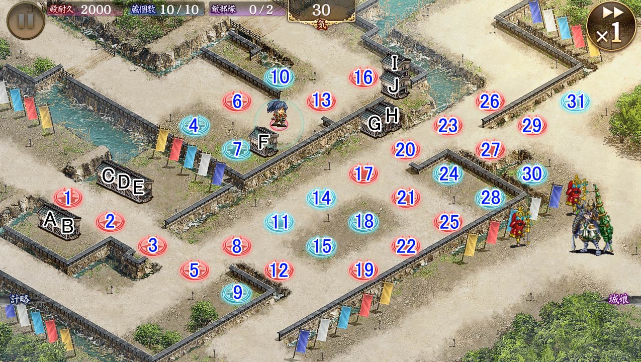 今は「再戦」が有るんだから実際に試してみれば良いと思う。とは言え、一応解説すると、30に大砲を置くと法術2人と撃ち合いになって速攻大破する。あと、28を右下とすると30はその右。氏康は下から入ってきて19,22,25...と移動するんだから、9に届くなら当然12にも届く。というか、「9に届く」と氏康の移動経路(ステージ確認動画で確認できる)から攻撃される可能性の有る範囲が特定できる。 --
