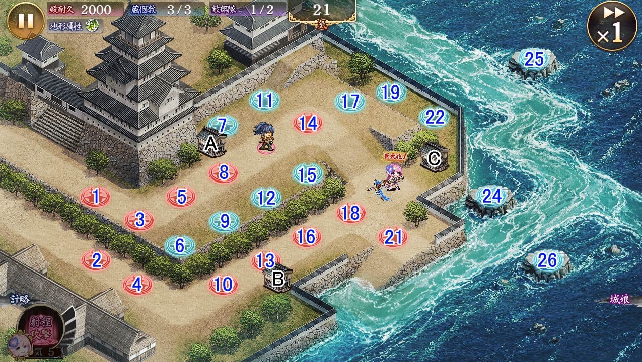 | 今回の合戦の難易度「普通」では、 『[夏]白鷺城』がお助け城娘として登場しています。 再配置や撤退を行うことはできませんが、巨大化と計略を駆使して勝利を目指しましょう。 |
