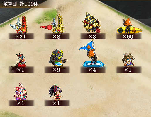 | 今回の合戦では、特殊効果により次の効果が発動しています。 特殊効果『九夏三伏』 敵味方問わず、全ての[夏]城娘の攻撃、防御が200上昇。  |