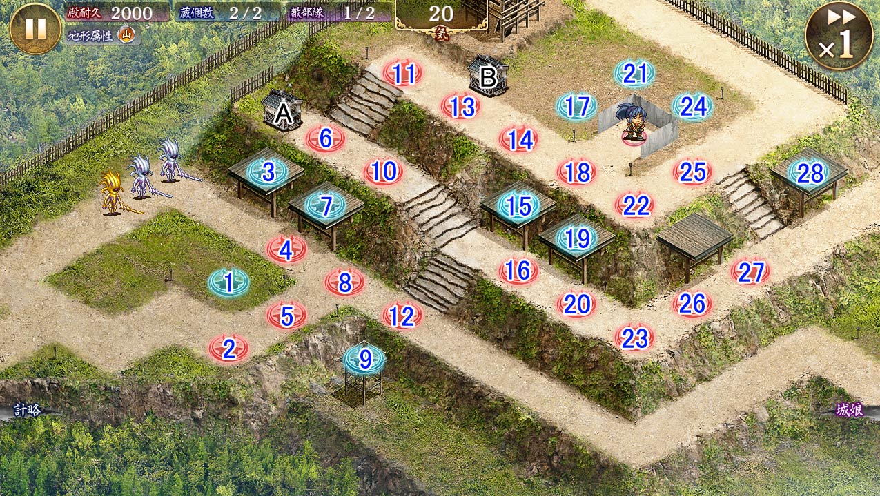 | 今回の合戦の難易度「普通」では、 『吉野城』がお助け城娘として登場しています。 再配置や撤退を行うことはできませんが、巨大化と計略を駆使して勝利を目指しましょう。  |