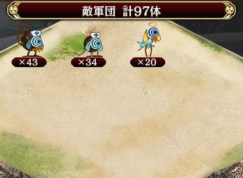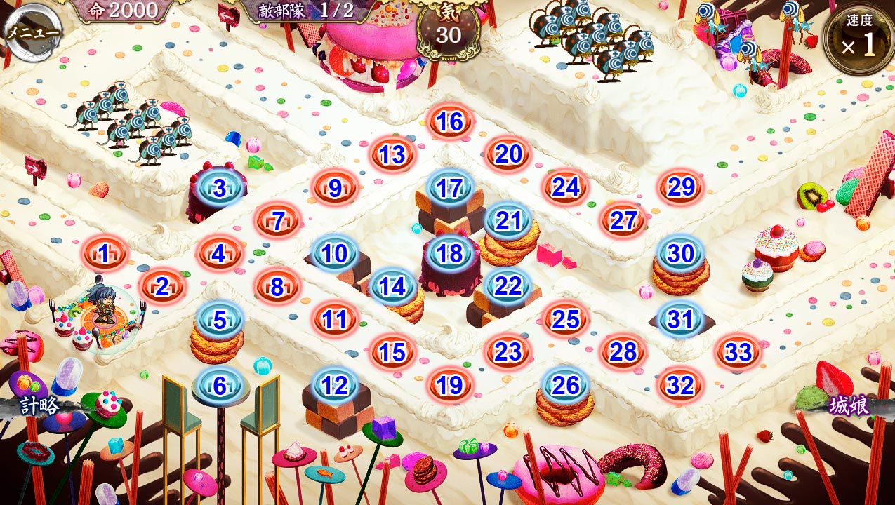 10、14に鳥取城と札、5、12に鶴ヶ岡城とあと一人攻撃バフ持ち置いて全員最大化すれば平均LV30ちょいでもボスは落とせる。鳥取と札のレベルが30以下だと最大化してもボスにワンパンされるから注意が必要。歌舞はバフ目的なので近接の強さ次第で両方レベル1でもいい。地上の敵は……頑張って --