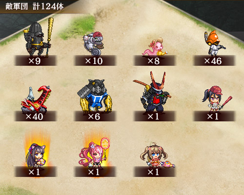 | ステージ上で待機している天衝前立形兜(番長ver)以外の敵軍ユニットは、 殿に向かって進行を始めるまで攻撃を行わず攻撃対象になりません。 |